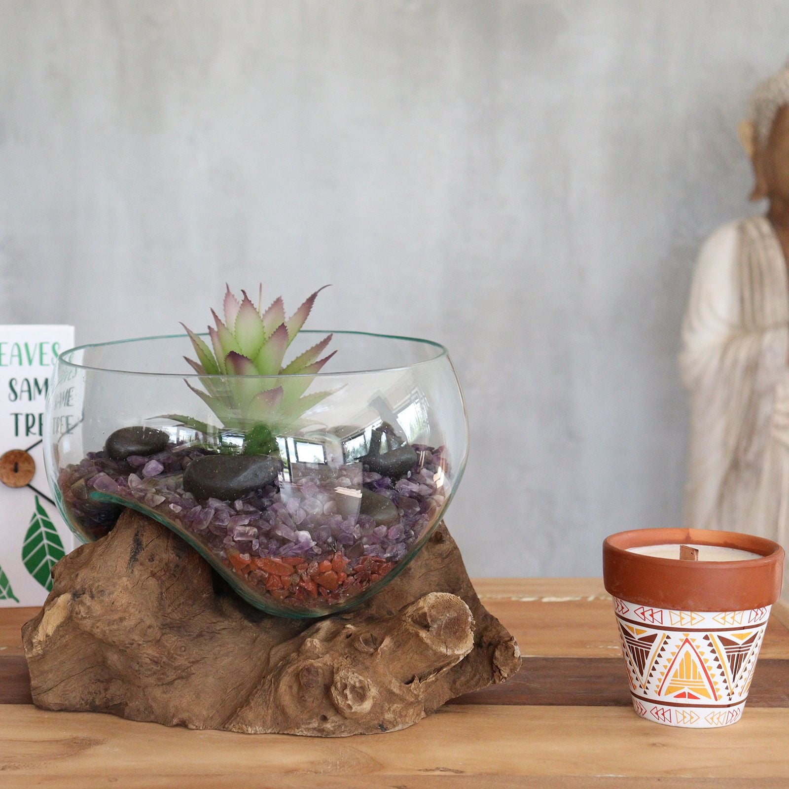 Naše ručne vyrábané tavené sklo na dreve je pravdepodobne najväčšou novinkou na Bali za posledné roky a v Holandsku je už teraz obrovským trendom. Všetko, čo súvisí s izbovými rastlinami a je prírodné, je hlavným trendom a tento krásny a prírodný produkt je presne to pravé. Sú ručne vyrobené na Bali z recyklovaného skla a balijského dreva Gamal pre AWGifts - Dropshipping . Táto úžasná váza z taveného umeleckého skla spája to najlepšie z dvoch svetov: prírodné a umelé; zemité a elegantné; praktické a duchovné.